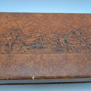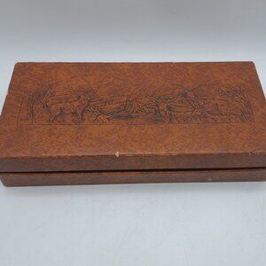 This is a boxed stainless steel knife set made in Sheffield, England in the Lion Brand name (my understanding is that it was a name used by George Wood & Sons). It includes 6 steak knives, a knife sharpener, a serving fork and a carving knife all with faux stag handles. The box, decorated with deer on faux leather, is 15 1/4" wide, 7 1/2" deep and 2 7/8" in height.