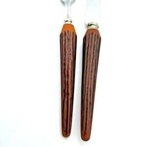 Material and Design: The pieces have stainless steel (SS) blades and tines, paired with decorative Bakelite handles molded to imitate the look and texture of stag horn or antler (known as "faux stag").