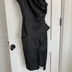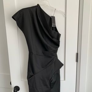 Black Asymetric Dress with hip detail. Has a black cloth belt included. One shoulder. Falls just below knee. New condition. Tags are still attached. Never been worn.