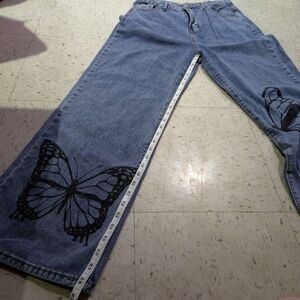 Stylish blue jeans featuring elegant butterfly graphic. Perfect for a casual yet chic look.