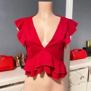Peplum V neck Ruffle hem Crop length Runs Small Pit to pit 17 inches Length 19 inches