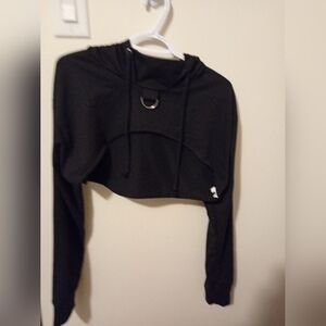 Introducing the Shein Cropped Bolero Drawstring Black Sweater Crop Top Tiny Top in size L - perfect for those who love to stand out. This pullover hoodie features a solid pattern and long sleeves with a crew neckline for a classic fit. The drawstring closure adds a touch of uniqueness to the top, making it perfect for travel, activewear, party/cocktail, or casual occasions. The lightweight and breathable material makes it suitable for all seasons - winter, summer, fall, and spring. The hoodie is adorned with festival, punk, emo, alternative, Gothic, and goth themes - perfect for those who want to make a statement. Whether you're going for a walk or just want to lounge around, this hoodie is perfect for you.