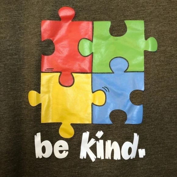 Adorable “be kind” slogan on the front with graphic of puzzle pieces.