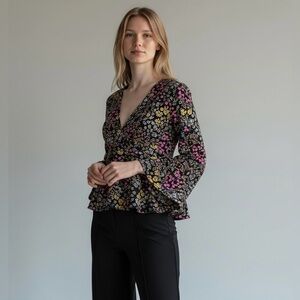 Whimsical charm blooms in this delightful floral blouse. A cascade of vibrant pink, yellow, and blue blossoms dance across a classic black backdrop, creating a visually stunning piece. The flattering V-neckline and button-front design add a touch of sophistication, while the long sleeves offer versatility for any season. The relaxed silhouette ensures a comfortable and flattering fit. This blouse is perfect for adding a pop of color to your everyday wardrobe, whether you're heading to a casual brunch with friends or enjoying a sunny afternoon picnic in the park.
