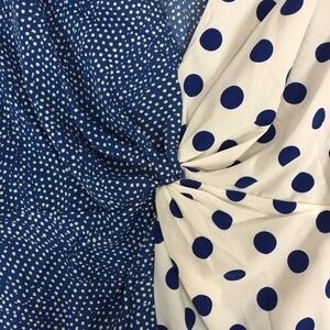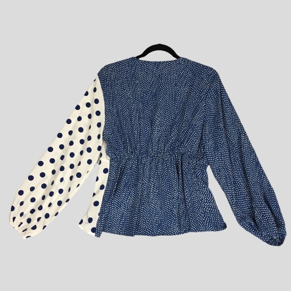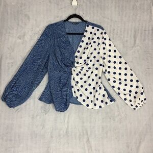 Shein Curve Blouse. Women's Tag Size 0XL. 100% Polyester - very lightweight. Blue and white polkadot pattern. V Neck with twist front. Long sleeve. Elastic cuffs and rear waist band. Irregular, flared hem. Chest darts.