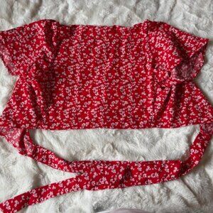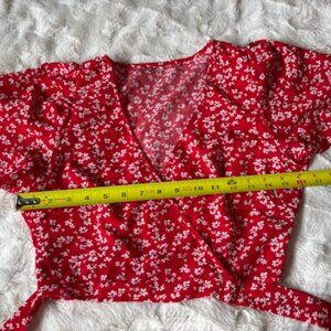 Shein Ladies Red White Floral Crop Wrap Top V-Neck Short Sleeve Blouse Size XS