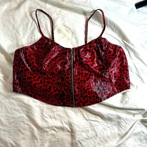 Shein Red Cheetah Print Faux Leather Top, very stretchy, and Promiscuous! Labelled to be a size 4XL, see pictures for more measurements:) 19” Bust 19” Length