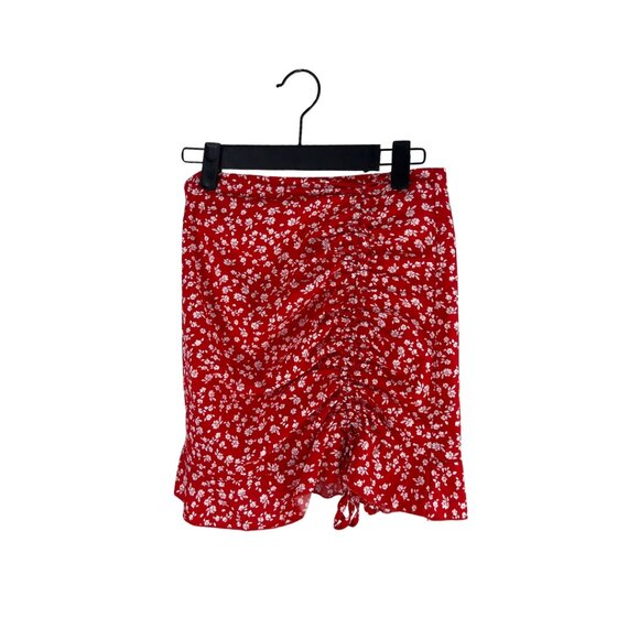 Red fabric with delicate white flower print. A cute ruffle at the hemline. Lacing down the front left side that you can pull to create a gathering on the body of the skirt. In excellent used condition.