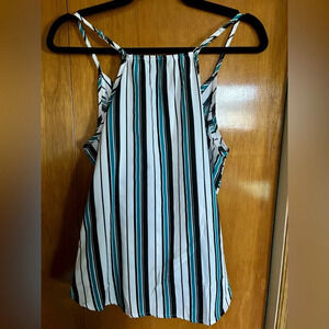 This Shein sleeveless top features a chic wrap design with eye-catching teal and black stripes. The lightweight fabric and relaxed fit make it perfect for summer outings or layering. Adjustable spaghetti straps and an elastic back ensure a comfortable fit. Size: L. Measurements are approximate: Bust 38”, Length 24”. Pre-owned, in excellent condition with no flaws.