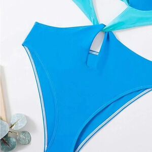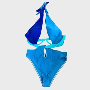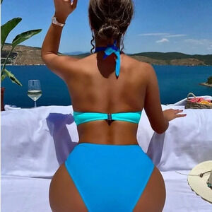 colorful, colorblock, hollow out, crisscross front, halter straps, tie back, backless, underwire, summer, sexy, resort, swimming, vacay, vacation, aqua, cerulean, turquoise,