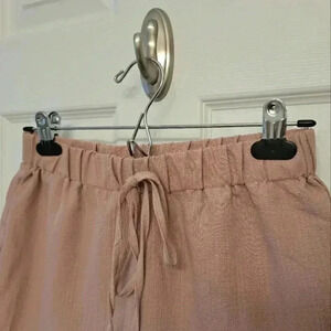 Lightweight neutral colour , elastic waist with a faux drawstring.