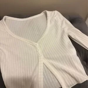 Stylish white ribbed cardigan with button-up front. Perfect for layering.