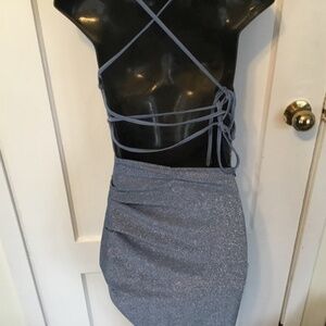 SheinBae sparkly blue clingy dress, size 4. Body fitting dress that clings to body , open back with crisscross straps. Great for those summer cruises or dinner on the town, add a pair of white sandals and a light sweater and you are ready to roll.
