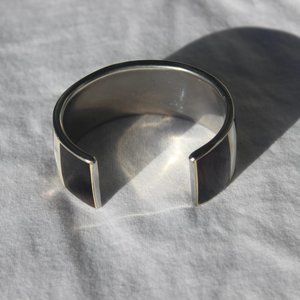 This Lovely cuff is in good condition with little wear on the inside. It is inlaid with mother of pearl. It is one inch wide.