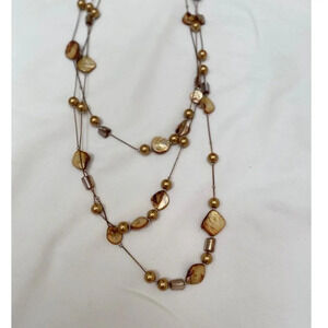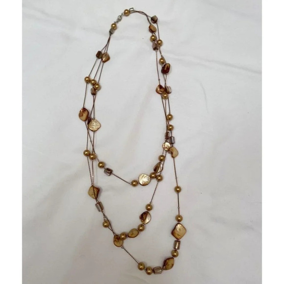 Great layering necklace made with authentic shell beads. Purposely bronzed silver chain. Excellent condition. Approx. 20-24”