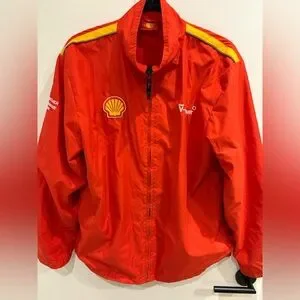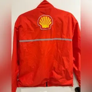 Vibrant red Shell windbreaker Ferrari jacket with yellow accents. Features logo patches on the front and sleeve and back.