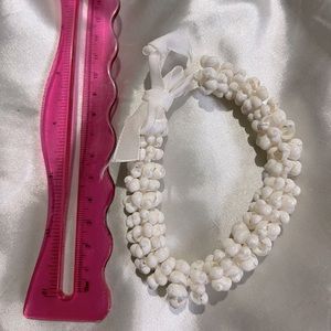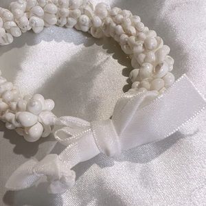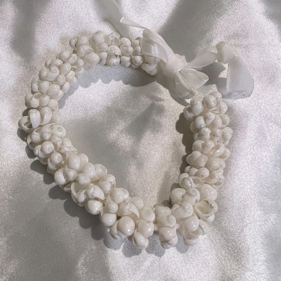 Lovely light bracelet made from tiny white shells. Tied with a white ribbon. I think if you have a small ankle you could also wear it as an anklet which would be so pretty in the summer with a dress.