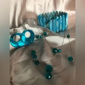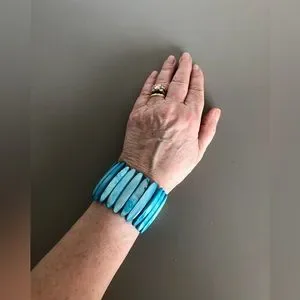 Gorgeous, iridescent, shell / mother of pearl cuff bracelet coloured in bright blue hues. Elasticized for easy wear. EU condition.