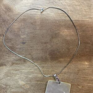 Shell pendant is approx 1.5” x 2.5” and the necklace is stamped . I tried to use a magnifier app to read what it is stamped with but it’s so teeny it’s impossible.