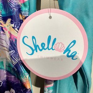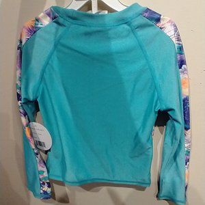 Teal colored rash guard set. The set comes with 1 rash guard and 1 bikini bottom. The top is a pullover styling, crewneck; with long sleeves. Lightweight stretch-infused fabric.