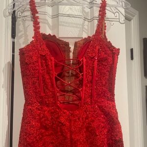 High side slit, corset style top with lace up open back. Lots of lace bead detailing on the dress overlay.