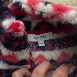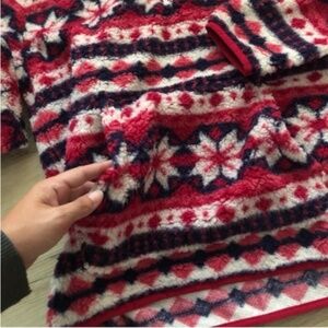 Stay warm and stylish with this cozy women's sweater featuring a vibrant red and white pattern. Perfect for chilly days.