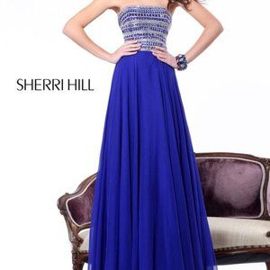 This beautiful Sherri Hill classic prom dress is a size 6 with minimal wear and tear. It needs to be ironed to get rid of some of the indents from being in my closet but they come out very easily.