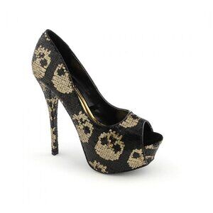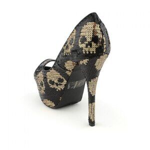 Skull sequin high heels shoes from the Shiekh collection. This balck and gold high heels pairs well with gold accessories and black jeans.