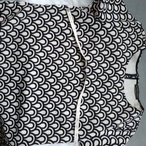 Cream and black shift dress, short sleeved, with some stretch. This pattern and cut serves mod and art deco, and the colouring is quite chic.