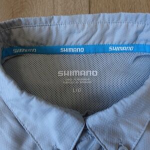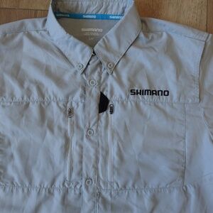 Shimano men’s short sleeve fishing shirt in size Large. Lightweight 100% polyester with vented mesh back for breathability. Features button-front closure, two vertical zippered chest pockets, and Shimano logo embroidery on chest and back. Designed for comfort and performance on the water — quick-dry, moisture-wicking, and easy to wear all day.