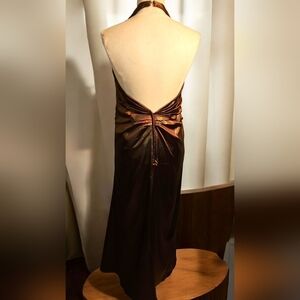Stunning brown maxi dress with a shimmering finish. Perfect for evening events. Elegant halter neckline.