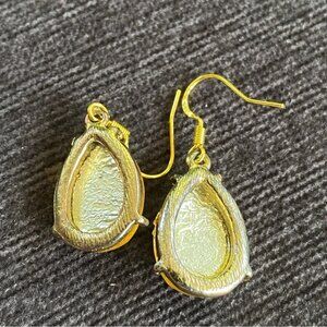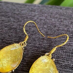 Beautiful gold foil backed plastic teardrop earrings that are a citrine yellow color in the light