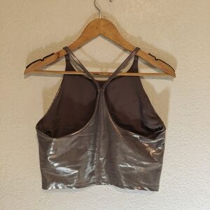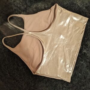 Elevate your style with this shimmering gold top. Perfect for any occasion, this top adds a touch of elegance to your wardrobe. Perfect addition for a night on the town, or even a workout with its built-in bra, you'll elevate your comfort in every scene!