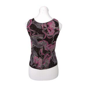 90s vintage sparkly Onyx Night black and pink floral print with pink glitter fabric, loose fitting, 90% acetate 10% spandex, made in the USA