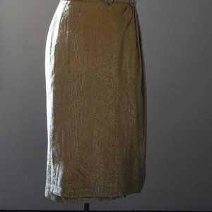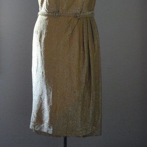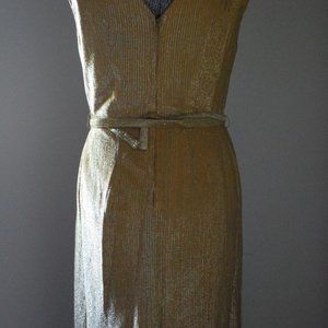 This shimmery gold dress is made of a metallic gold fabric and is lined with a mustard coloured material that shines through to give it an extra glow. It has beautiful pleating on the left shoulder that is repeated at the waist on the left side to accentuate the wrap detailing.