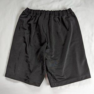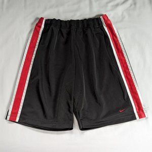 Black polyester basketball shorts with red/white shiny dazzle stripe. Reverse side is silky/shiny dazzle material.