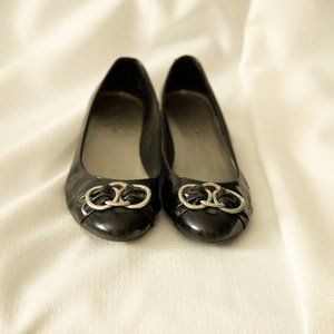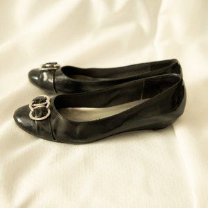 Shiny black flats with decorative buckle