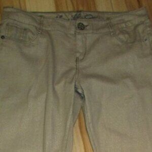 Skinny jeans, made of shiny denim. Stretch fabric. Brand : Vanilla Sky. Fabric: 98% cotton/2% spandex denim. Color : Beige. Size : 7.