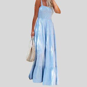 Shirred Striped Multi-Layered Spaghetti Strap Sleeveless Dress Blue