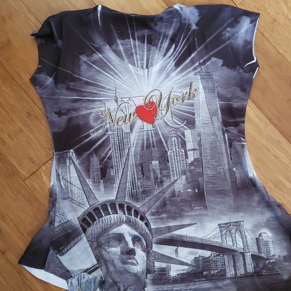 New york tee shirt the front has shiny jewels, also the front bottom corners are v shaped very cute never worn.