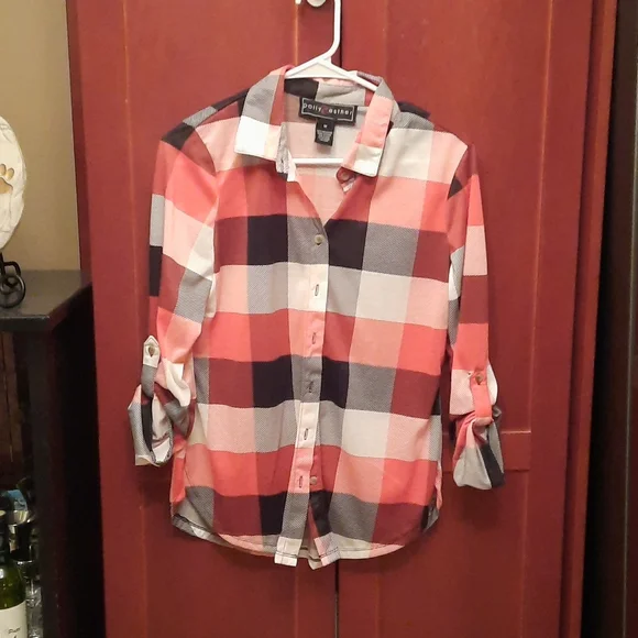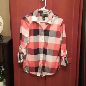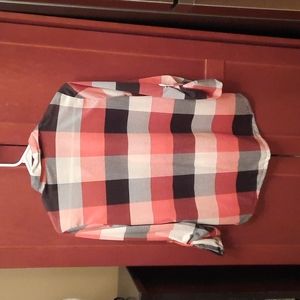 Long sleeve plaid shirt. Reds, black and white. Never worn. Smoke free.