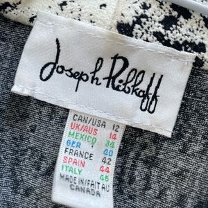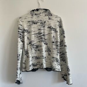 Stylish black and white blazer with textured pattern. Features elegant trim and tailored fit. Ideal for professional or casual wear.