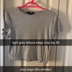 Light grey crop top- size l but fits s, not extremely tight but comfortable