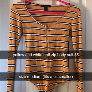 yellow and white half zip body suit- as i have a long torso the zip sits really low but it’s a nice piece of clothing:) size m