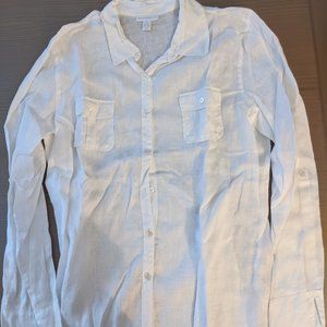 Long-sleeved and short-sleeved shirts, size Large or XLarge, all in cotton or linen. Brands: Ravel, Laura, San Francisco, Contemporary, Small Coats, Reitmans, Charter Club, Banana Republic. Colors: white, beige, blue with stripes..
