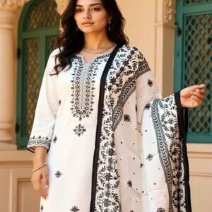 Step into timeless elegance with this White Embroidered Kurta Set with Trousers & Dupatta from Shivansh Creations. Crafted from premium pure cotton fabric, this 3-piece set offers a perfect blend of comfort and festive charm.