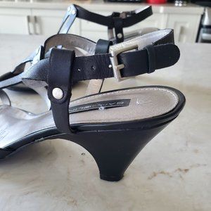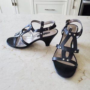 Beautiful leather sandals with approx. 3" sturdy heel from Bandolino. Black with silver hardware. Worn once, in mint condition. Original box. Selling lots of shoes in new and mint condition - bundle and save.