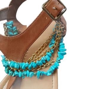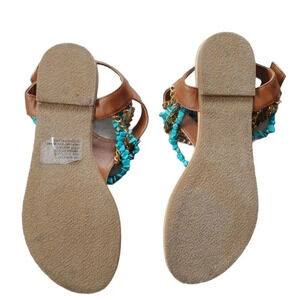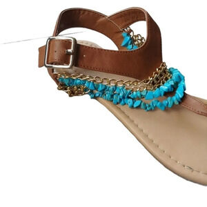 Beautiful multi strands of aqua blue stones and gold coloured metal chains. Flip flop style flat sandal with faux leather straps. Light padding upper on the sole; non slip on underside.