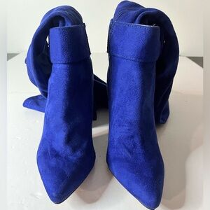 Elevate your style with these stunning ShoeDazzle “Darla” over-the-knee boots in a vibrant cobalt blue. Featuring a pointed toe, chunky high heel, and soft faux-suede upper, these boots are perfect for making a bold statement. The side zipper closure and adjustable buckle strap ensure a secure and stylish fit, while the cushioned insole adds extra comfort.