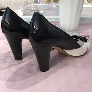 White & black patin leather with black embellishment over open toe with chunky 3 in heel.